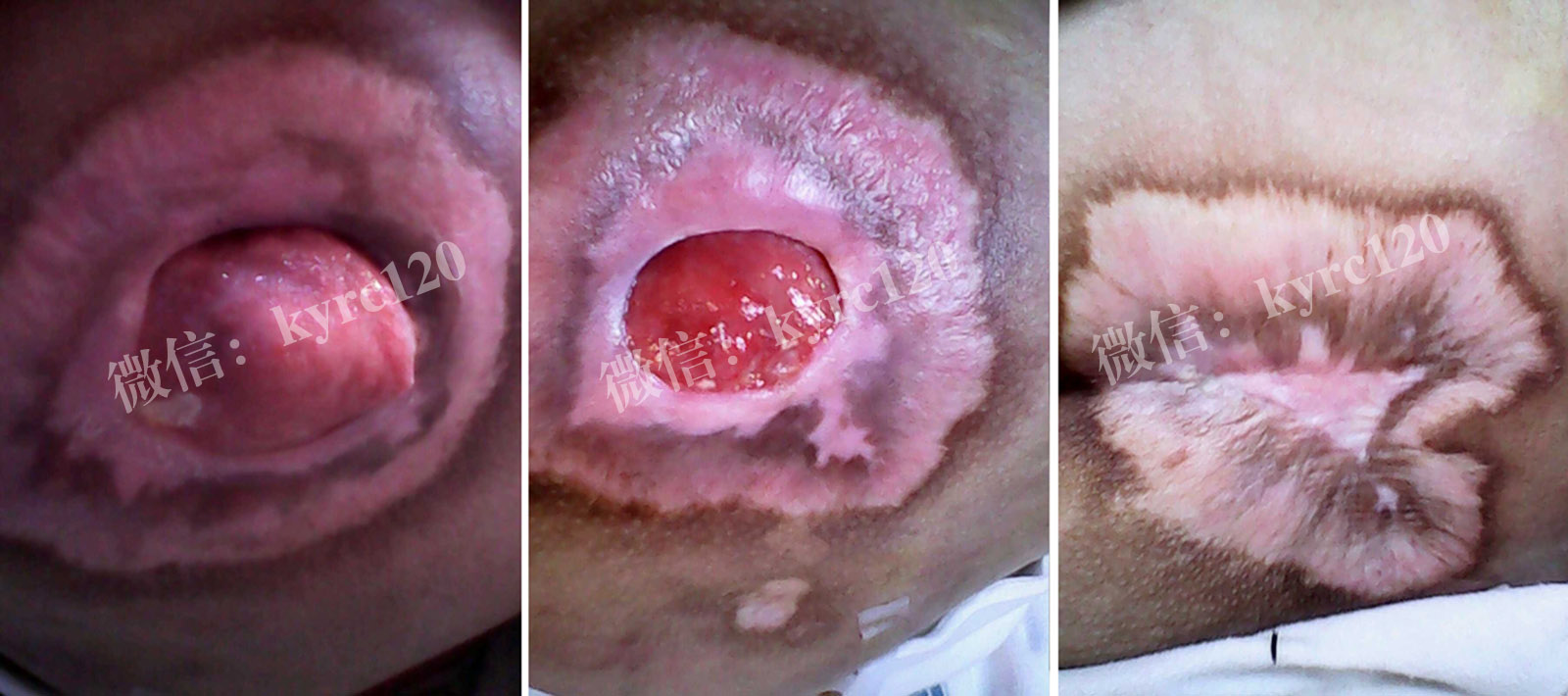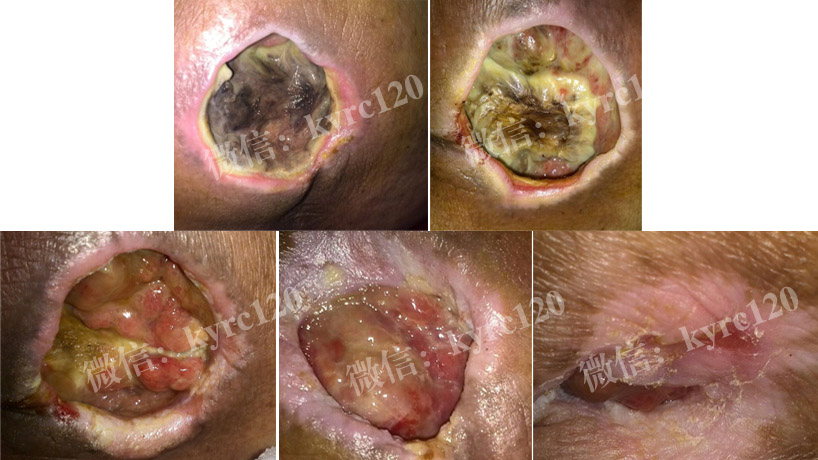 西安未央区李先生的父亲,96岁阿尔茨海默症(老年痴呆)卧床3年,黑痂性褥疮,在我处的指导下,采用"煟脓祛腐生肌疗法"先化除黑痂及痂下脓液腐肉,在生肌长肉,红色的肉芽出现,伤口周围长出白线,伤口明显的变化家属非常高兴。63天后家属发来照片并表示万分感谢(如上图)!
