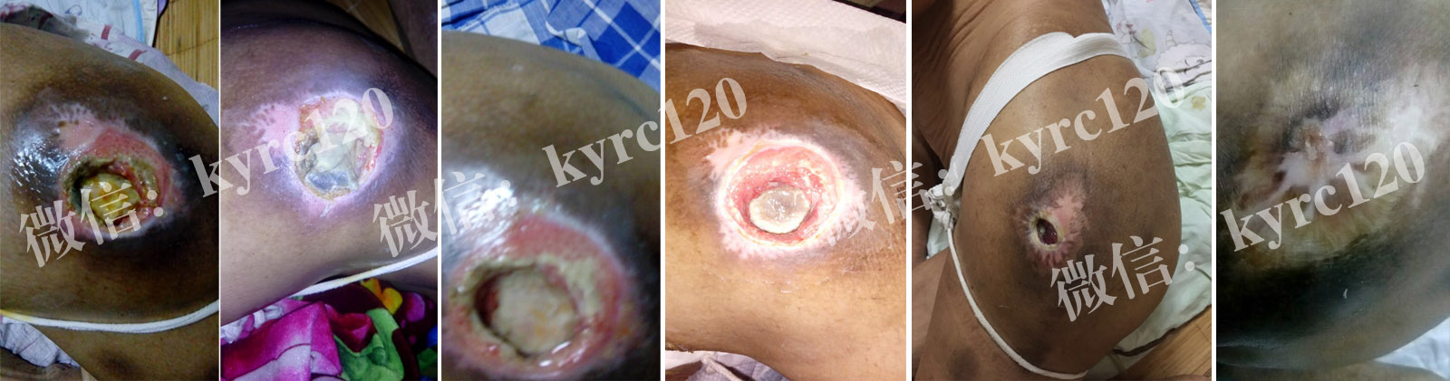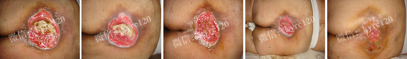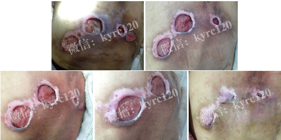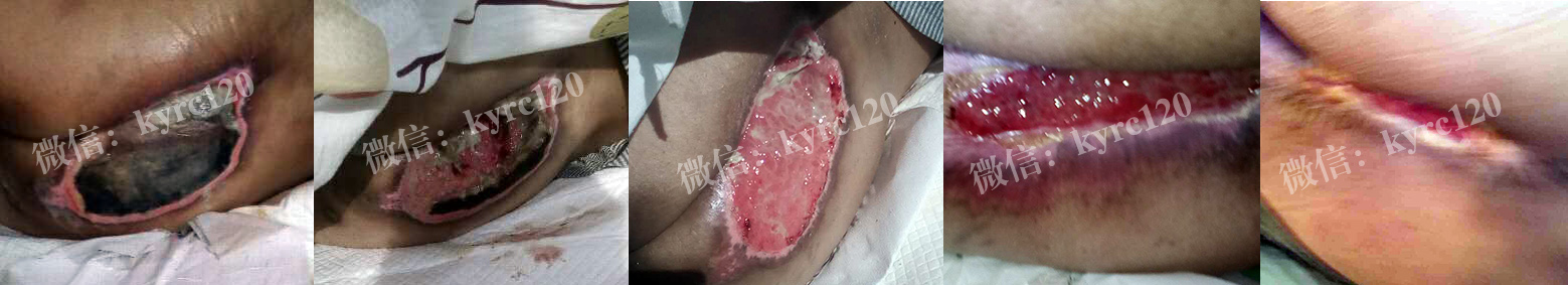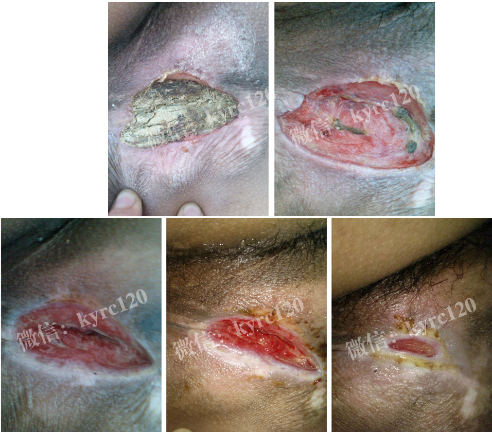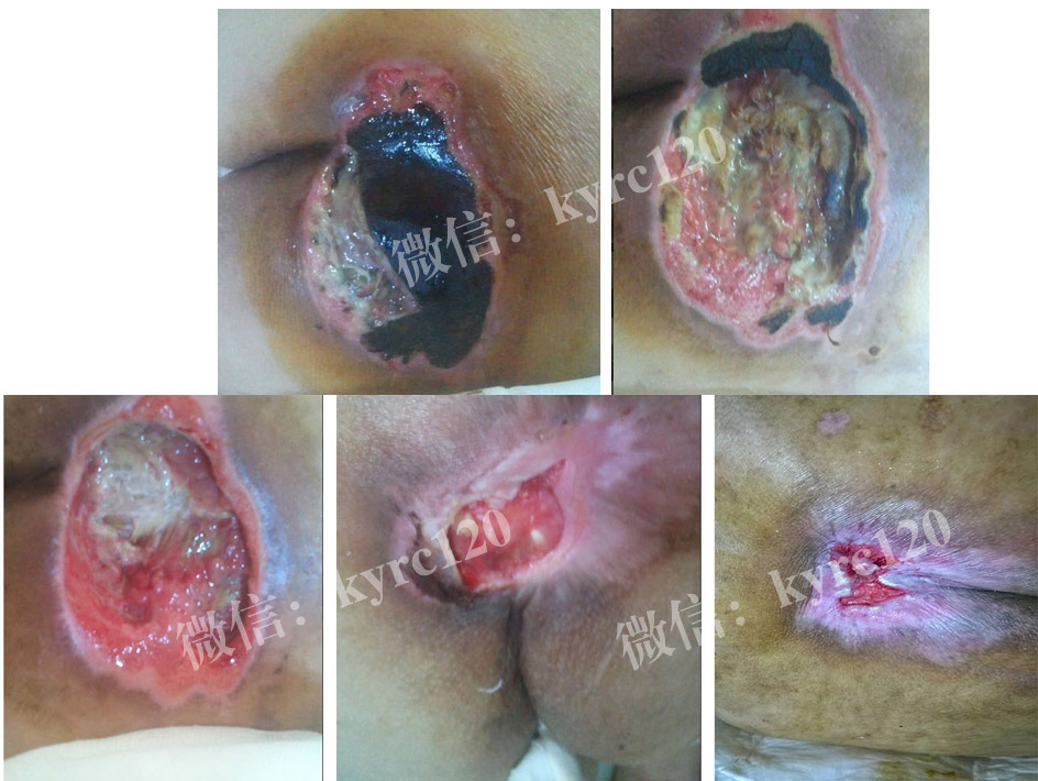 家住济南历城区的,孙女士,由于脑血管畸形破裂,瘫痪长期卧床,由于家庭负担偏重,上有老,下有小,家人疏与护理,出现尾骶部褥疮(约5X6CM)黑痂比较硬。尝试不少方法,得不到控制。与我处联系,我处专家认为患者主要是治疗操作不当导致的,黑痂型褥疮。在我处专家指导下采用煟脓祛腐生肌疗法,先软化消除黑痂,排出腐肉,让肉芽组织从内往外一步步生长,前后二十天患者比较满意。(过程如上图)!