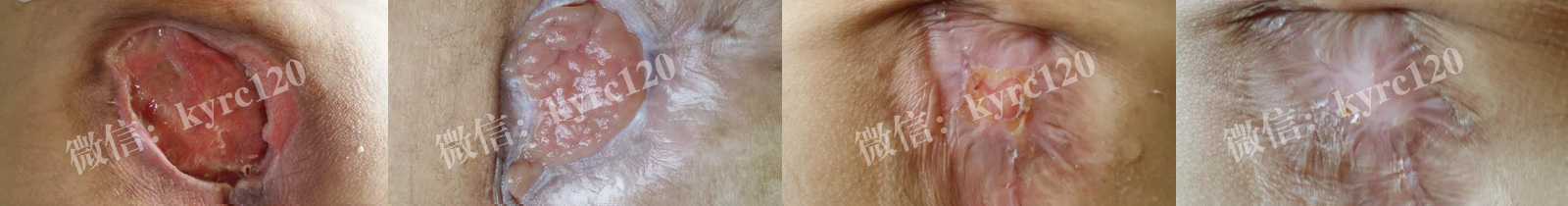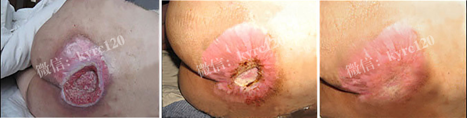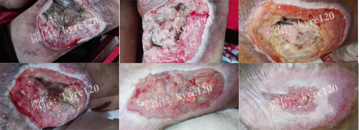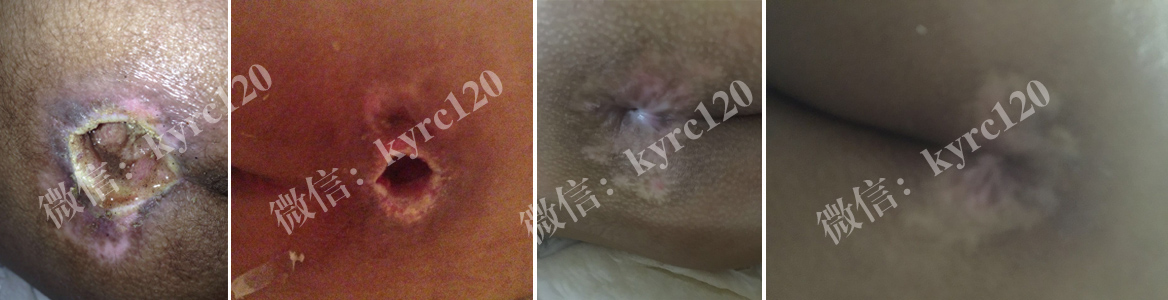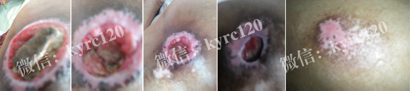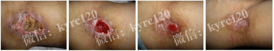湖南衡阳的,付先生46岁,从高空坠落,造成神经损伤截瘫,造成尾骨部,大腿根部出现褥疮,创面约6x6大面积溃烂且比较深,有黄色脓液和恶臭。采用我处煟脓,祛腐,生肌方法,排出腐肉脓液,肉芽组织长出,上皮组织收口,患者及家人都很满意。(如上图)