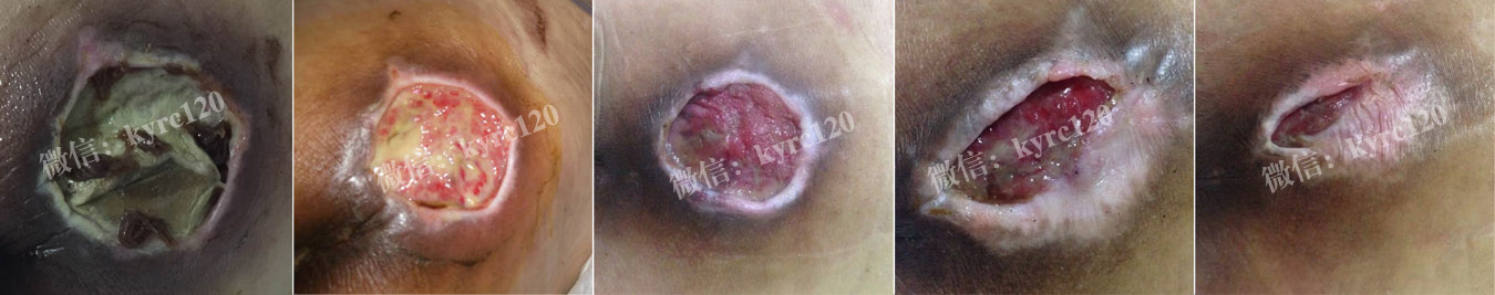 山东阳谷县 曹女士母亲 83岁 脑出血导致卧床。左侧胯骨部出现溃烂,创面5cmX5cm深约5cm,创面周围组织发黑,内有大量黄色渗出物,恶臭明显;经我处专家指导,祛腐肉,生新肌,让肉芽组织从创面底部向外一层一层生长,由里到外可见明显"粉嫩颗粒状肉芽"组织生长,创面周围逐渐出现白线形成,上皮组织长出,疮面明显缩小,使表皮组织完整覆盖!