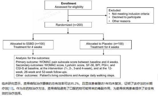 膝关节骨关节炎的随机双盲对照试验一项正在进行的随机、双盲、安慰剂对照试验针对200名膝关节骨关节炎(OA)患者,评估中药蒸骨疗法(SSBD)的疗效。患者被随机分配到SSBD治疗组或安慰剂组,每周进行3次治疗,每次30分钟,共治疗4周。 主要结局指标为4周时WOMAC疼痛评分的变化,次要结局包括WOMAC僵硬和功能评分、Lysholm膝关节量表评分、生活质量等。数据显示SSBD组在疼痛缓解和功能改善方面表现优于安慰剂组[1]。 这些临床研究数据共同证明,中医特色疗法特别是联合疗法在治疗颈肩腰腿痛方面具有显著优势,不仅能有效缓解疼痛症状,改善功能,还具有较低的复发率和副作用,为患者提供了安全有效的治疗选择。 蒸骨疗法联合捶龙肌筋松解技法的优势与前景蒸骨疗法与捶龙肌筋松解技法的联合应用在治疗颈肩腰腿痛方面展现出显著优势。临床研究表明,这种联合疗法治疗腰痹42例,显效率达42.9%,总有效率高达95.2%,且显效患者随访1年均未复发[13]。这种联合疗法通过多重机制协同作用:蒸骨疗法利用药热双重作用促进药物透皮吸收,而捶龙肌筋松解技法则直接作用于肌肉组织,松解粘连,改善局部血液循环。 联合疗法相比单一疗法具有以下优势: 1,疗效更显著:联合疗法从**周的70%有效率提升至第四周的90%,而单一疗法仅从60%提升至75%,表明联合疗法不仅效果更好,提升速度也更快。 2,安全性高:作为非药物治疗方法,避免了口服药物可能带来的毒副作用,为患者提供了安全有效的治疗选择[13]。 3,复发率低:临床随访显示,接受联合疗法的显效患者1年内未见复发,证明了该疗法的长期疗效[13]。 4,适用范围广:适用于多种筋骨疾病,包括腰痹、颈肩痛、骨关节疾病、膝关节骨关节炎及风湿性疾病等[8]。 未来应用前景1. 标准化与规范化:随着临床研究的深入,蒸骨疗法与捶龙肌筋松解技法的操作流程将更加标准化,治疗方案更加规范化,有助于提高治疗效果的稳定性和可重复性。 2. 循证医学支持:正在进行的随机、双盲、安慰剂对照试验将为联合疗法提供更加可靠的循证医学证据[1],增强其在医学界的认可度。 3. 中西医结合创新:未来可探索将联合疗法与西医理疗方法相结合,如电疗、超声波治疗等,形成更加全面的治疗体系。研究表明,中西医结合治疗组患者的疼痛评分和功能评分均显著优于单纯西医治疗组[5]。 4. 技术创新与升级:蒸骨膏贴可进一步优化药物配方和剂型,提高药物透皮吸收效率;捶龙肌筋松解技法可结合现代生物力学原理,开发辅助器械,提高操作精准度。 5. 预防医学应用:联合疗法不仅可用于治疗,还可用于预防筋骨疾病的发生和复发,特别是对于高风险人群,如老年人、长期伏案工作者和运动员等[16]。 随着人口老龄化和久坐生活方式的普及,颈肩腰腿痛的发病率呈上升趋势。蒸骨堂蒸骨疗法联合捶龙肌筋松解技法作为安全、有效、经济的非药物治疗方法,将在筋骨疾病的预防和治疗中发挥越来越重要的作用,为患者提供更加全面的健康保障。 参考来源: