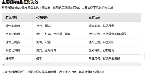 捶龙肌筋松解技法作为中医特色疗法,在临床实践中展现出良好的治疗效果,特别是与蒸骨疗法联合应用时,能够为颈肩腰腿痛患者提供安全有效的非药物治疗选择。 蒸骨膏贴是基于中医传统蒸骨疗法原理研发的现代外用制剂,通过药物与热力的协同作用,有效缓解筋骨疼痛症状。 蒸骨膏贴对不同部位的疼痛具有特异性治疗效果: 1,颈肩部位:对颈型颈椎病引起的颈肩痛有良好缓解作用,通过改善局部血液循环,松解粘连的肌纤维,减轻肌肉痉挛[4]。 2,腰部:针对腰椎骨质增生、腰椎间盘脱出等引起的腰痛,蒸骨膏贴通过温经散寒、活血化瘀作用,有效缓解疼痛症状[13]。 3,膝关节:对膝关节骨关节炎患者,蒸骨膏贴能显著改善WOMAC疼痛评分,提高关节活动度[1]。 4,下肢:对腰椎间盘突出症引起的下肢放射痛,通过改善神经根周围微循环,减轻神经根受压症状[13]。